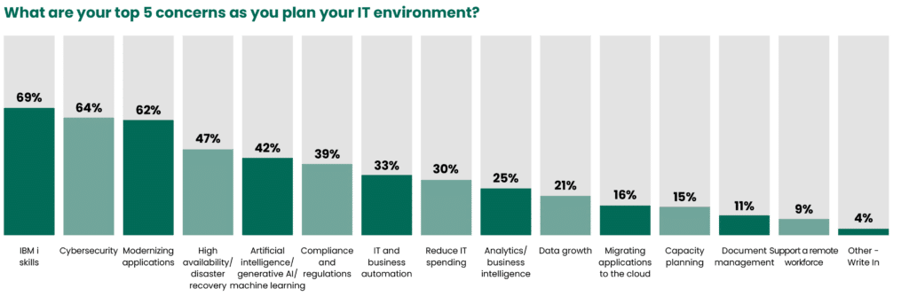 Tekoälyyn liittyvät aiheet, kuten generatiivinen AI ja koneoppiminen, nousivat jo viidenneksi suurimmaksi huolenaiheeksi, ja osuus kasvoi 42 %:iin. Tämä kertoo siitä, että AI:n merkitys IBM i -ympäristöissä kasvaa nopeasti sekä mahdollisuutena että riskinä.